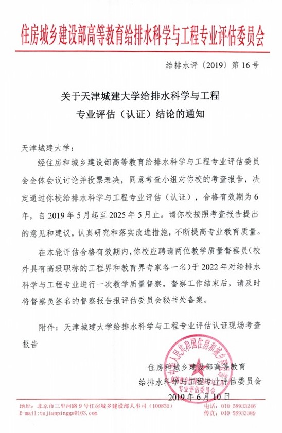 6月10日,住房和城乡建设部下发《关于天津城建大学给排水科学与工程专业评估(认证)结论的通知》(给排水评〔2019〕第16号),决定通过天津城建大学给排水科学与工程专业评估(认证),合格有效期为6年(2019年5月-2025年5月)。