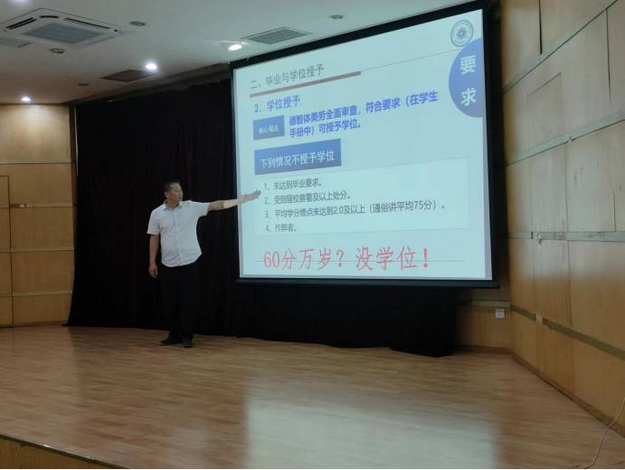 为进一步指导新生详细了解学校关于学籍管理的相关规定,保障学生的合法权益,从校规校纪严格要求学生,加强学风建设,必赢766net手机版于9月5日晚在鸣飞堂一楼进行本科生学籍管理规定解读讲座,主讲人为教学管理办公室主任张宏伟老师,2023级全体新生参加本次讲座。