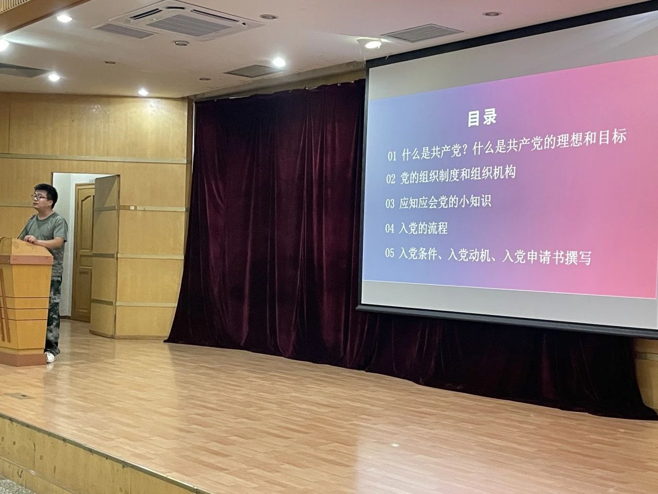 党课由学院学生工作办公室刘聪老师主讲,从“什么是共产党?什么是共产党的理想和目标”、“党的组织制度和组织机构”、“应知应会党的小知识”、“入党的流程”以及“入党条件、入党动机、入党申请书撰写”五个部分进行讲授。引导新生们要认真学习党的理论知识、坚定理想信念,增强对中华民族伟大复兴的责任感。鼓励新生们积极向党组织靠拢,加强自身理论学习和专业学习,夯实基础,以党员的标准严格要求自己,争取早日入党。