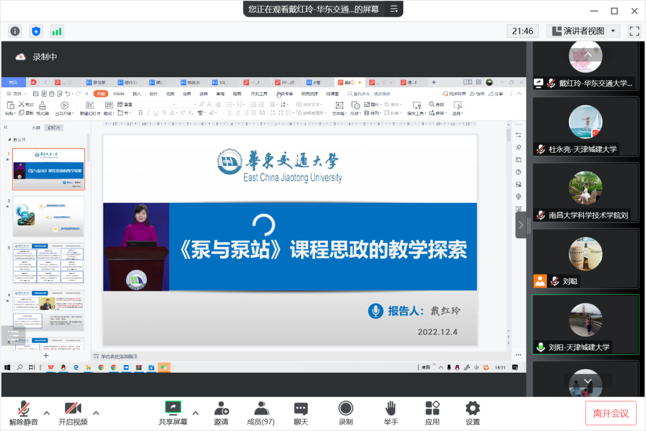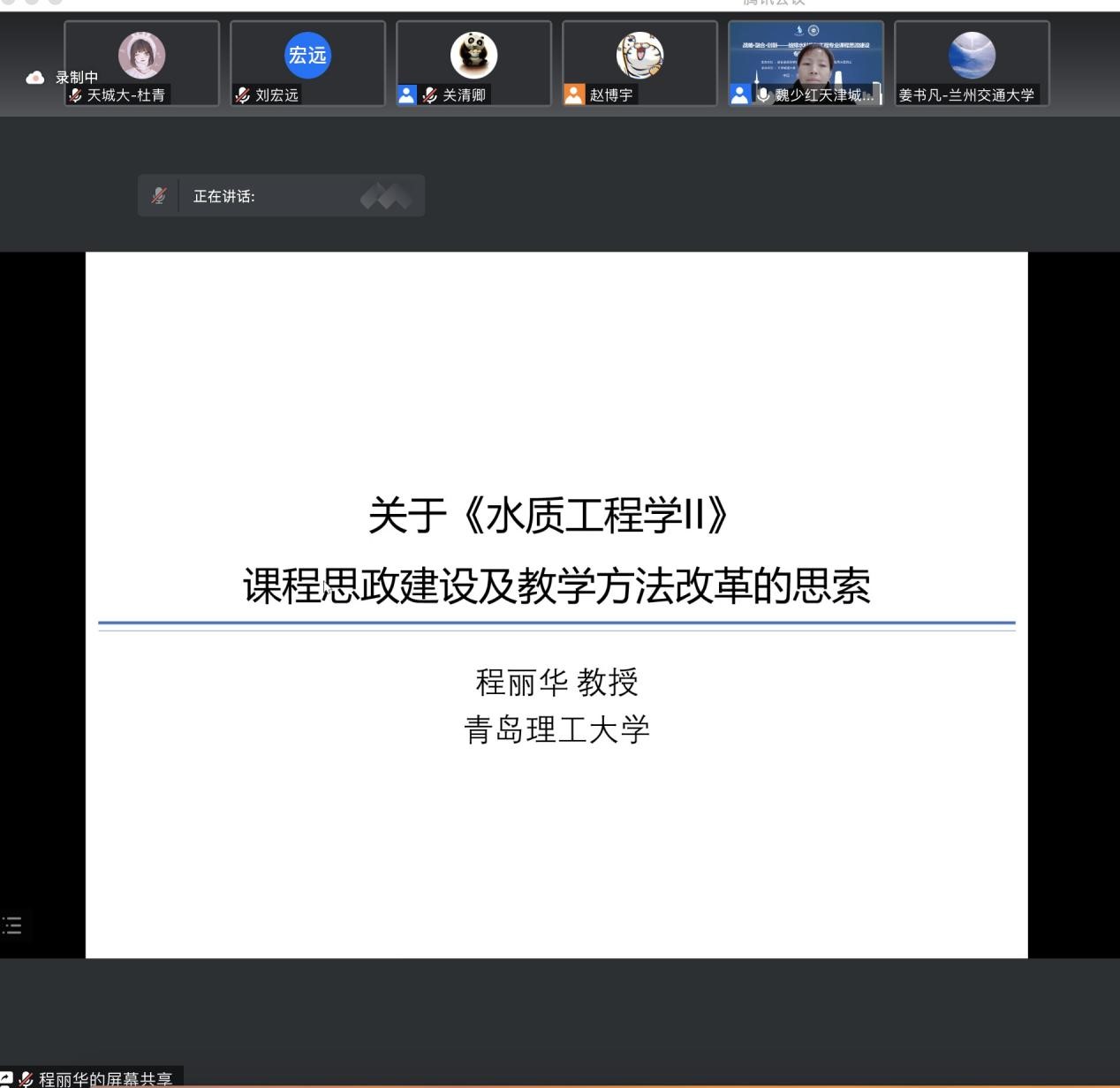 同济大学李树平副教授做“给水排水管网系统课程思政教育探索与思考”的大会报告,结合绿水青山就是金山银山、碳达峰碳中和两个专题提出了政治教育的思考;天津城建大学王少坡教授做“水质工程学(2)课程思政探索与实践”的大会报告,结合思政目标的确定、教学内容的重构、教学方法的优化、评价与反思、实施路径总结等方面提出了很好的建议。