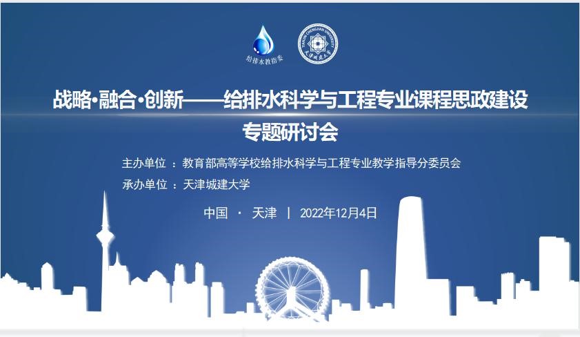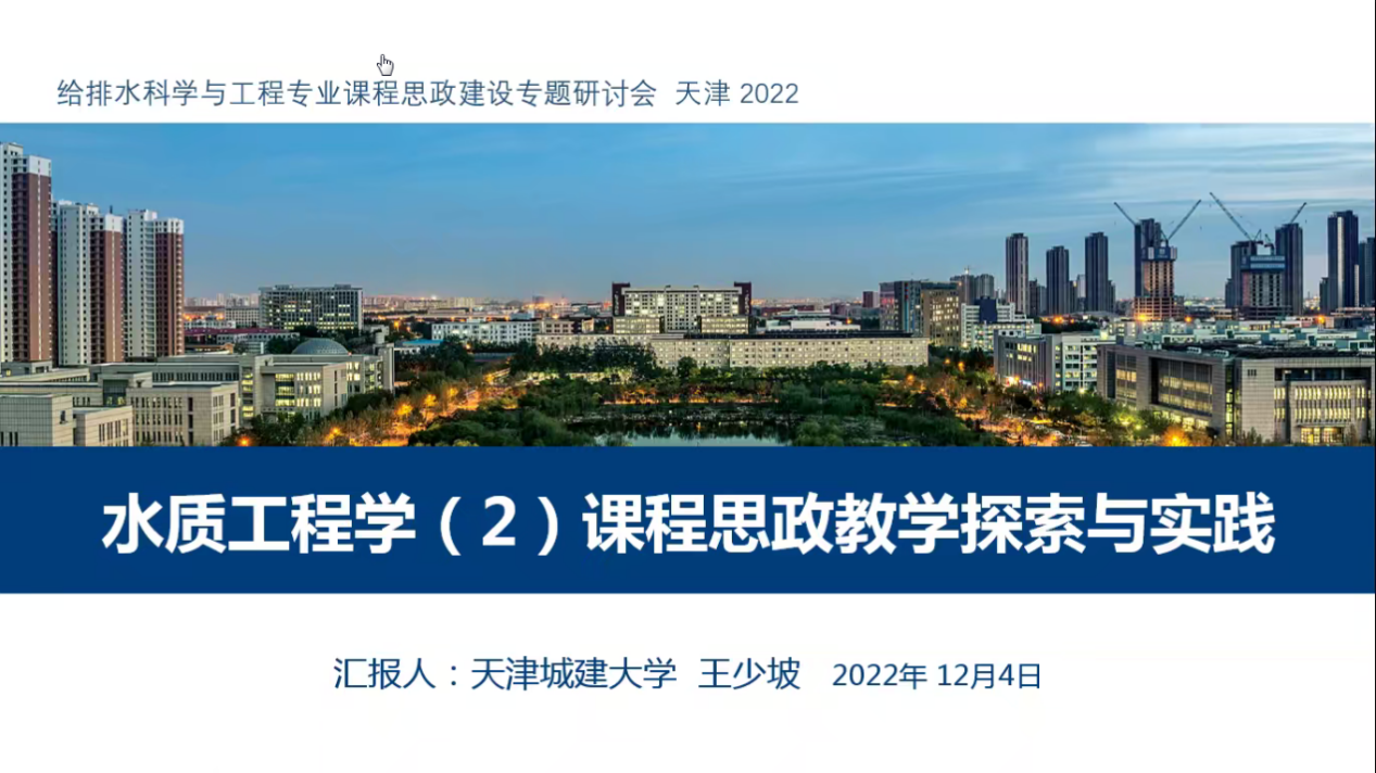 2022124月,由教育部高等学校给排水科学与工程专业教学指导分委员会(以下简称“给排水教指委”)主办,天津城建大学承办的“战略·融合·创新—给排水科学与工程专业课程思政建设专题研讨会”以线上会议的方式举行。会议同时开设网络直播并在全国虚拟教研室建设试点平台直播。共有来自全国132所院校、企业的626位教师和同行参加了此次大会。