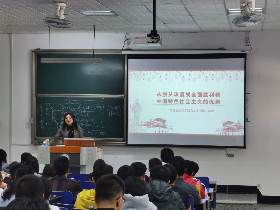 为引导全院师生“学史明理、学史增信、学史崇德、学史力行”,从党的百年伟大奋斗中汲取奋进新征程的智慧和力量,我院于4月28日中午邀请马克思主义学院党总支书记高燕老师以“从脱贫攻坚战全面胜利看中国特色社会主义的优势”为题为我院2021年重点培养对象、入团积极分子、全体班长支书上了一节精彩的党课。