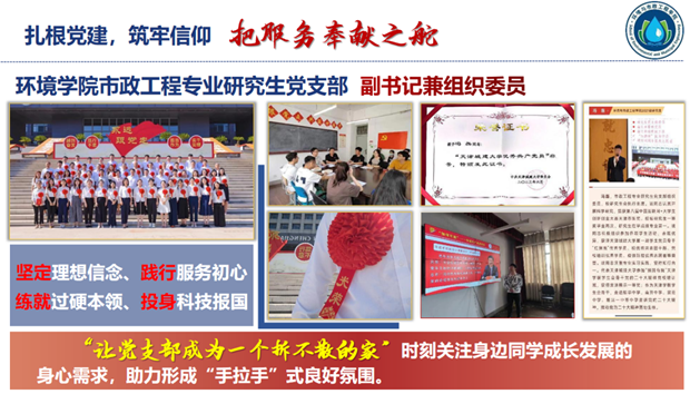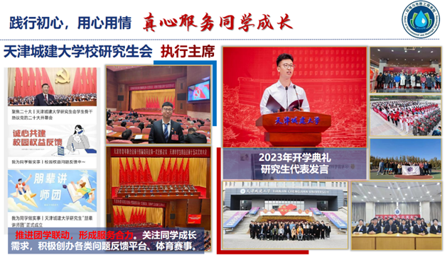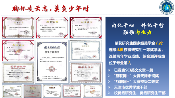 自入学以来,曾先后担任天津城建大学校研究生会执行主席、必赢766net手机版市政工程专业研究生党支部副书记兼组织委员、天津市学生联合会学生骨干,为我校第一期学生党员骨干“红旗班”学员、“强国有我”天津学联学生会党的二十大精神宣讲团成员;必赢766net手机版2022级研究生2班带班党员。在学习科研方面,曾获研究生国家奖学金、校研究生一等奖学金3次,连续两年学业成绩排名位于专业第一,已发表SCI论文一篇(JCR一区),第八届中国互联网+大学生创新创业大赛天津市铜奖(负责人),2023年天津城建大学互联网+校级二等奖(负责人)。