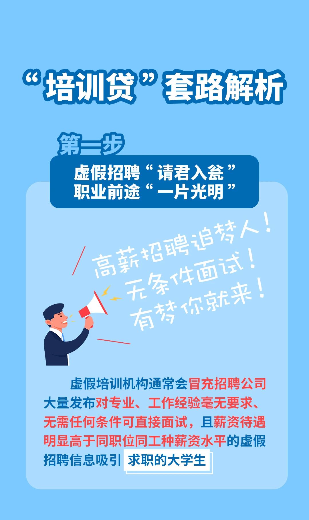 在此,提醒广大同学,务必增强防范意识和辨别能力,不要轻信培训机构所谓“边学边赚钱”“先学后付”等诱惑贷款的承诺,不要在陌生网络平台注册信息、转账汇款及办理贷款等,求职期间注意甄别招聘信息与公司资质,如遇搞不清、拿不准的情况,请及时与学校、家长沟通,理性判断,谨慎选择,避免落入“培训贷”陷阱。