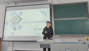 2019年10月25日,应必赢766net手机版邀请,湖南纬度信息科技有限公司产品经理何新全来我院进行学术资源使用交流,并在东配楼405教室为我院广大师生作了题目为“SpiScholar学术资源在线使用”的讲座。