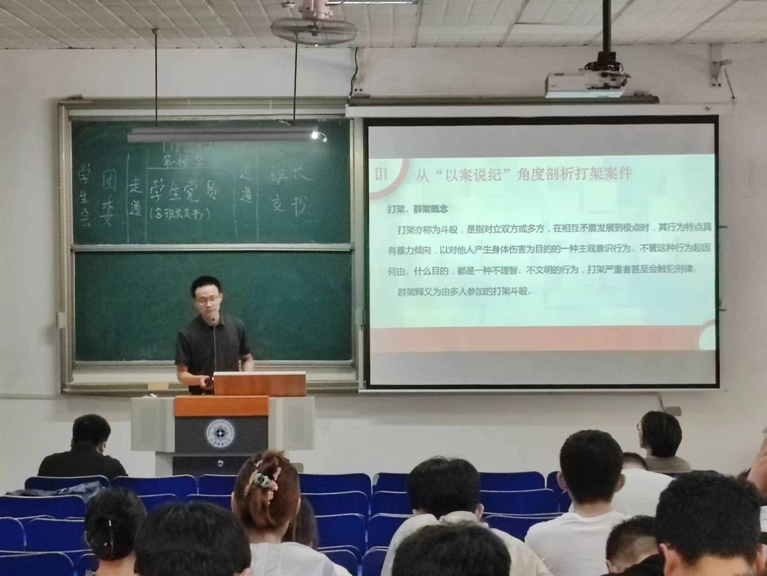 之后,安工部杨福来老师进行“说案明理”警示教育,他结合生动的案例给同学们从打架斗殴、网络安全、盗窃等方面进行深度剖析,进一步提升学生安全意识。