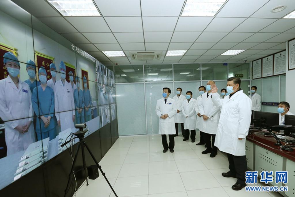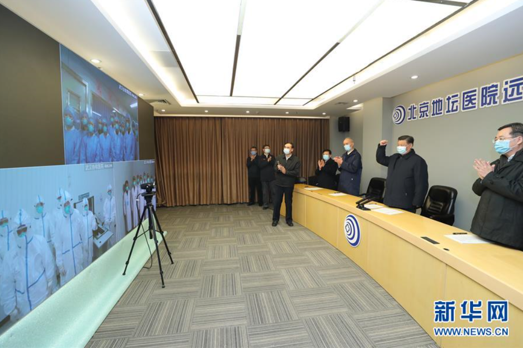 习近平十分牵挂湖北和武汉的疫情。在地坛医院远程诊疗中心,习近平通过视频连线武汉市收治新冠肺炎患者的金银潭医院、协和医院、火神山医院,向疫情防控一线的医务工作者、干部职工和人民解放军指战员了解情况、听取意见和建议。他强调,全国广大医务工作者不忘初心、牢记使命,响应党的号召,义无反顾冲上疫情防控第一线,同时间赛跑,与病魔较量,顽强拼搏、日夜奋战,展现了对党、对人民高度负责的精神面貌。他指出,现在疫情防控正处于胶着对垒状态,广大医务工作者一定要坚持下去,发扬特别能吃苦、特别能战斗的精神,发挥火线上的中流砥柱作用,始终把人民群众生命安全和身体健康放在首位,全力以赴救治患者,打好武汉保卫战、湖北保卫战。
