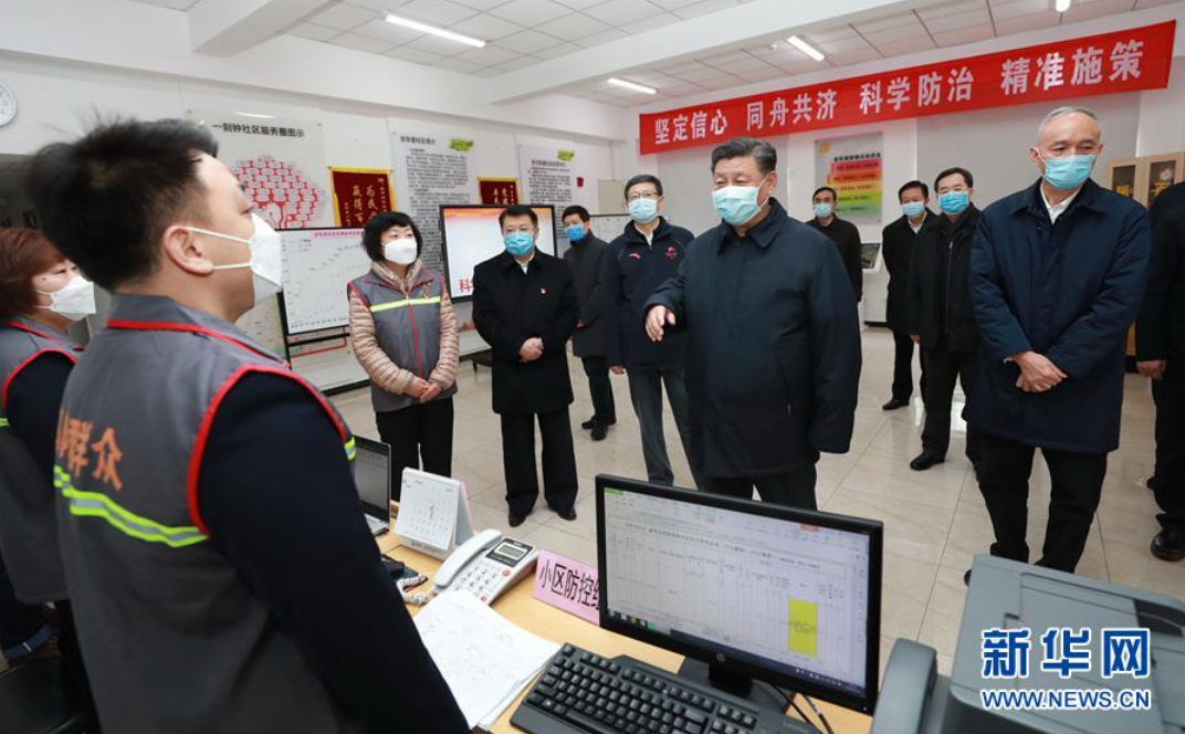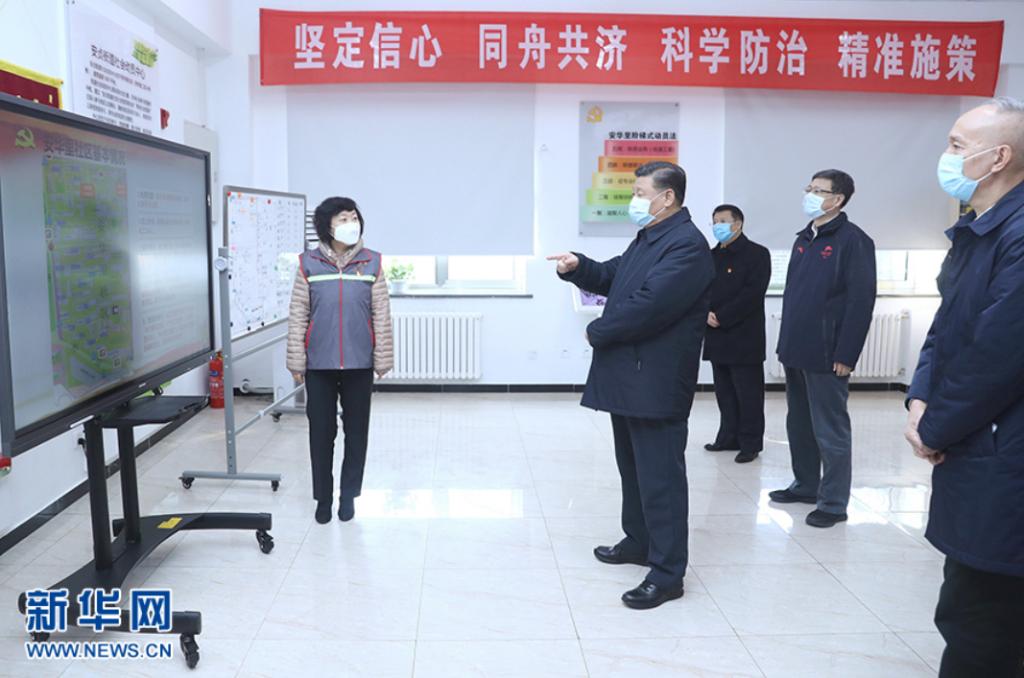习近平首先来到北京市朝阳区安贞街道安华里社区,了解基层一线疫情联防联控情况。在社区居民委员会疫情防控指挥部,习近平听取了安贞街道和安华里社区开展联防联控情况介绍。习近平对社区采取多项措施,落实防控责任,实现入户排查、重点群体监控“两个全覆盖”等做法表示肯定。他强调,社区是疫情联防联控的第一线,也是外防输入、内防扩散最有效的防线。把社区这道防线守住,就能有效切断疫情扩散蔓延的渠道。全国都要充分发挥社区在疫情防控中的阻击作用,把防控力量向社区下沉,加强社区各项防控措施的落实,使所有社区成为疫情防控的坚强堡垒。要以疫情防控工作成效来检验和拓展“不忘初心、牢记使命”主题教育成果,发挥基层党组织政治引领作用和党员先锋模范作用,把社区居民发动起来,构筑起疫情防控的人民防线。