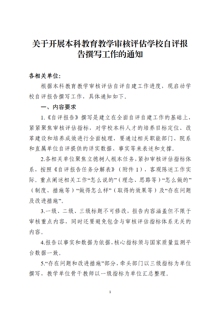 关于开展本科教育教学审核评估学校自评报告撰写工作的通知